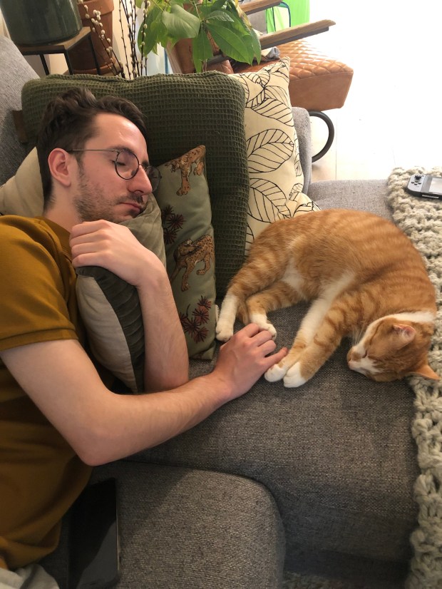 Dodo was in het begin niet blij met het idee van een baby in huis tot we hem vertelde dat baby’s geen katten snoepjes eten, dus hij niet hoeft te delen. Nu droomt hij er van de baby vogels te laten vangen zodat hij echt de hele dag kan blijven liggen. En werelddominantie, maar dat doet elke kat.